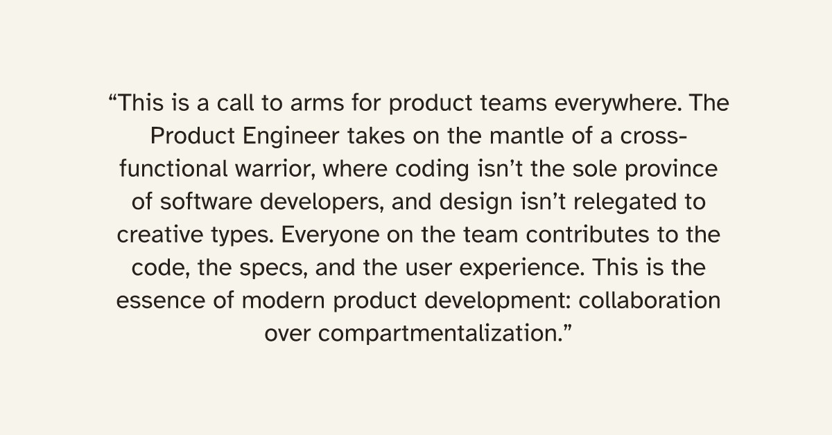 “This is a call to arms for product teams everywhere. The Product Engineer takes on the mantle of a cross-functional warrior, where coding isn’t the sole province of software developers, and design isn’t relegated to creative types. Everyone on the team contributes to the code, the specs, and the user experience. This is the essence of modern product development: collaboration over compartmentalization.”