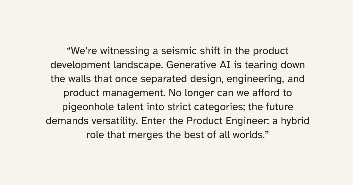 “We’re witnessing a seismic shift in the product development landscape. Generative AI is tearing down the walls that once separated design, engineering, and product management. No longer can we afford to pigeonhole talent into strict categories; the future demands versatility. Enter the Product Engineer: a hybrid role that merges the best of all worlds.”