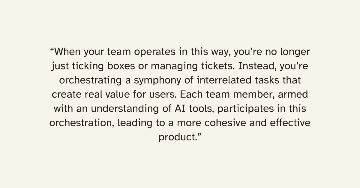 “When your team operates in this way, you’re no longer just ticking boxes or managing tickets. Instead, you’re orchestrating a symphony of interrelated tasks that create real value for users. Each team member, armed with an understanding of AI tools, participates in this orchestration, leading to a more cohesive and effective product.”