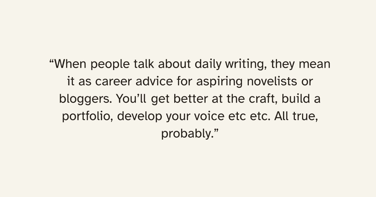 “When people talk about daily writing, they mean it as career advice for aspiring novelists or bloggers. You’ll get better at the craft, build a portfolio, develop your voice etc etc. All true, probably.”