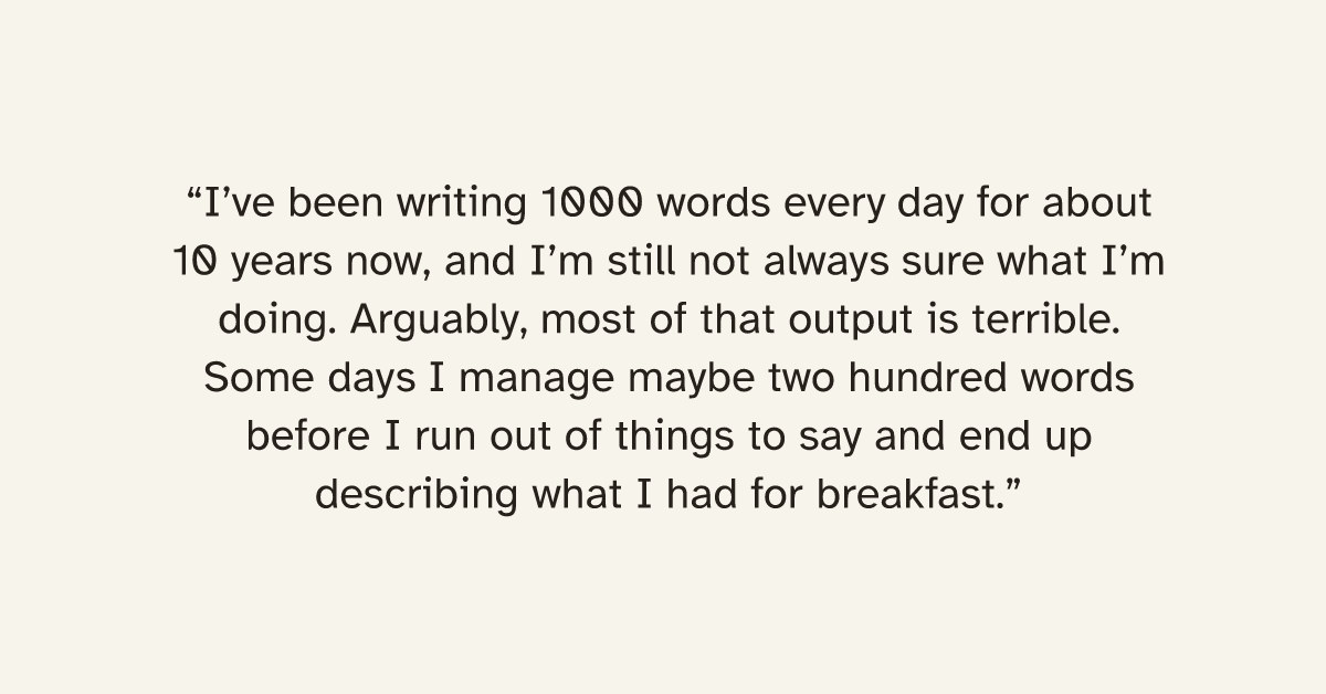 “I’ve been writing 1000 words every day for about 10 years now, and I’m still not always sure what I’m doing. Arguably, most of that output is terrible. Some days I manage maybe two hundred words before I run out of things to say and end up describing what I had for breakfast.”