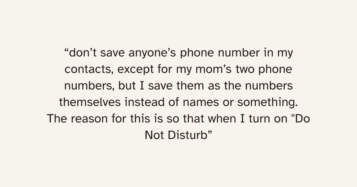“don’t save anyone’s phone number in my contacts, except for my mom’s two phone numbers, but I save them as the numbers themselves instead of names or something.